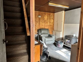 Kitchen - Includes solid fuel cast iron stove with back boiler. Storage available beneath stairs.